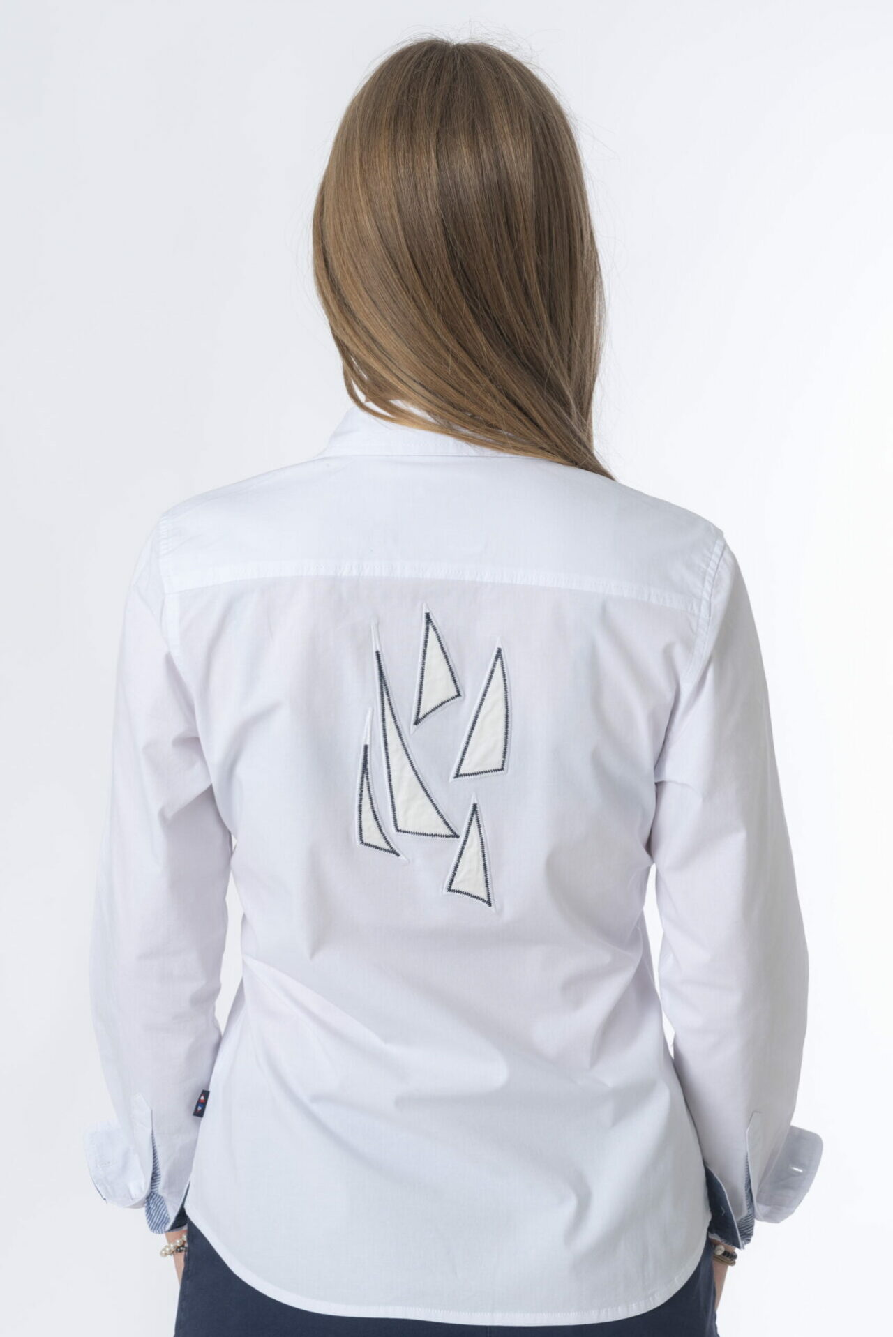La chemise Aquilon est dotée d’une coupe ajustée, ce qui souligne la silhouette féminine. Ses détails en chambray à l’intérieur du pied de col, aux poignets et sous la patte de boutonnage apportent une touche originale à cette chemise blanche. Elle arbore au dos la broderie emblématique de la collection 2022 de VST43° : les grandes voiles qui ne sont pas sans rappeler l’univers nautique. Elle présente également des broderies à la poitrine avec des détails graphiques.