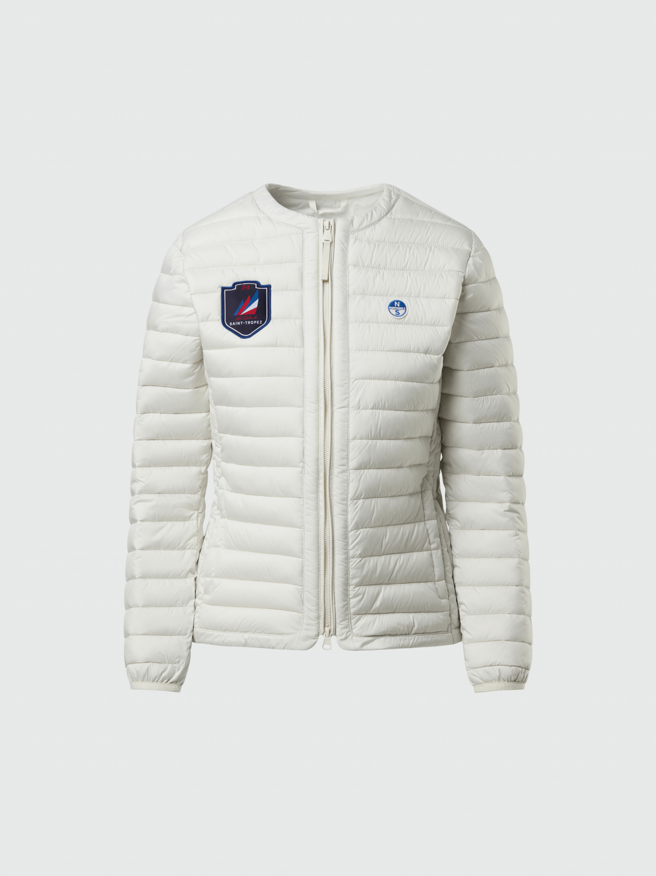 Veste matelassée à col ras-du-cou pour femmes, conçue en polyester mat recyclé de la collection Les Voiles de Saint-Tropez, orné d’un écusson de la régate 2024.