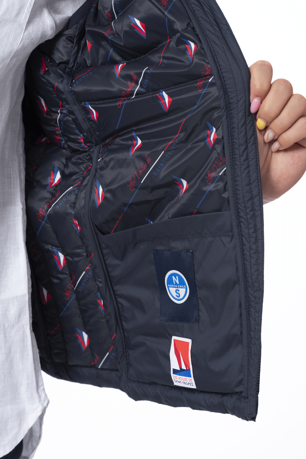 Fabriqué en microripstop recyclé. Col montant et fermeture à glissière. Poches à fermeture éclair pour une fonctionnalité maximale. Les bordures extensibles créent une sensation de confort. Impression LVDST sur la doublure. Marquage signature célébrant la régate Les Voiles de Saint-Tropez. Détails tricolores et écusson North Sails.