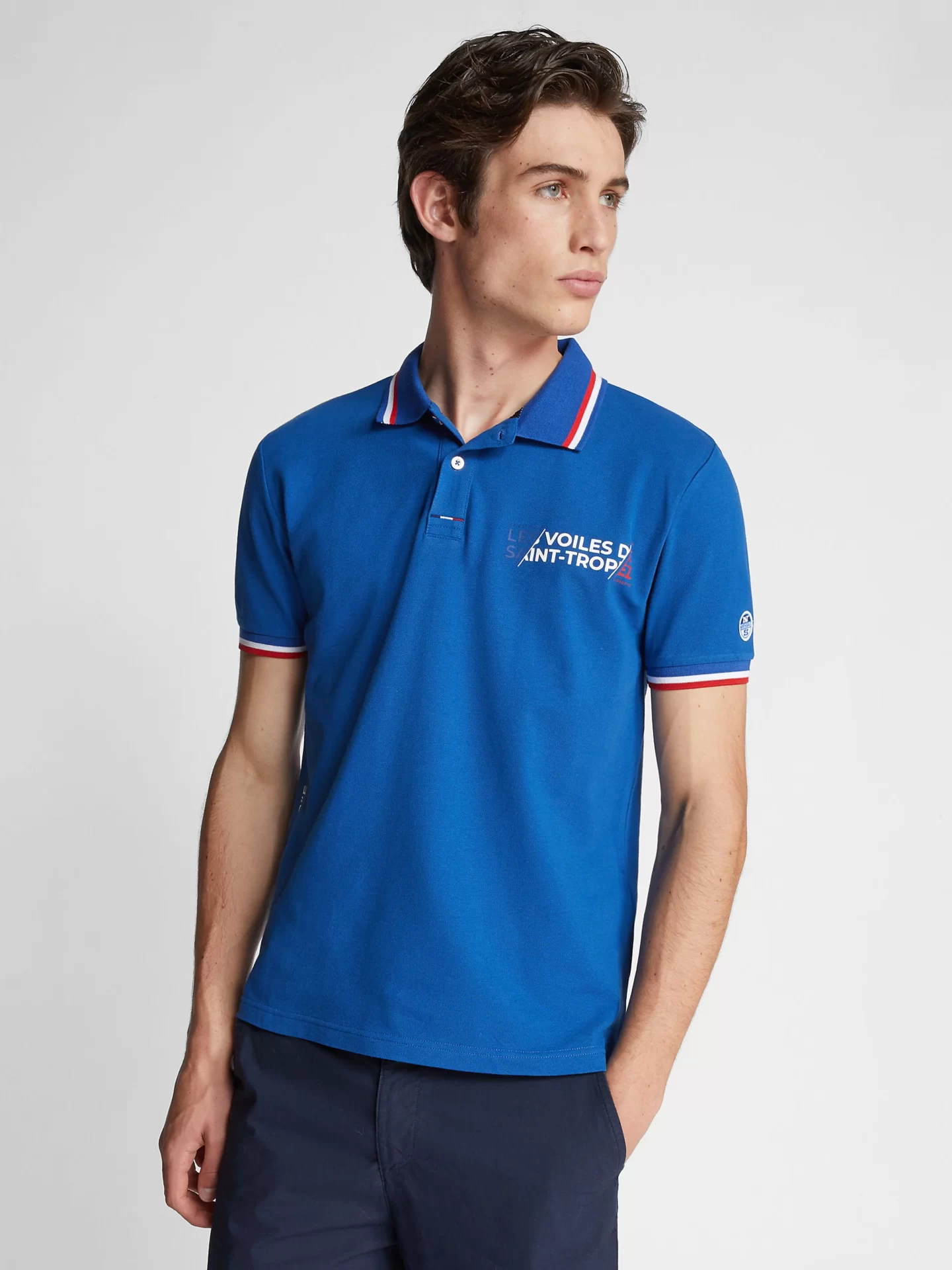 Ce polo, intégré à la collection Les Voiles de Saint-Tropez, présente une coupe standard avec un col polo classique et des manches courtes. Confectionné en piqué de coton biologique certifié, il a été conçu selon des principes socialement responsables et écologiques, sans utilisation de substances nocives. Sa coupe ajustée provient des liserés côtelés avec bordure contrastée. Les broderies et détails graphiques sont dédiés à cette régate historique : Les Voiles de Saint-Tropez.