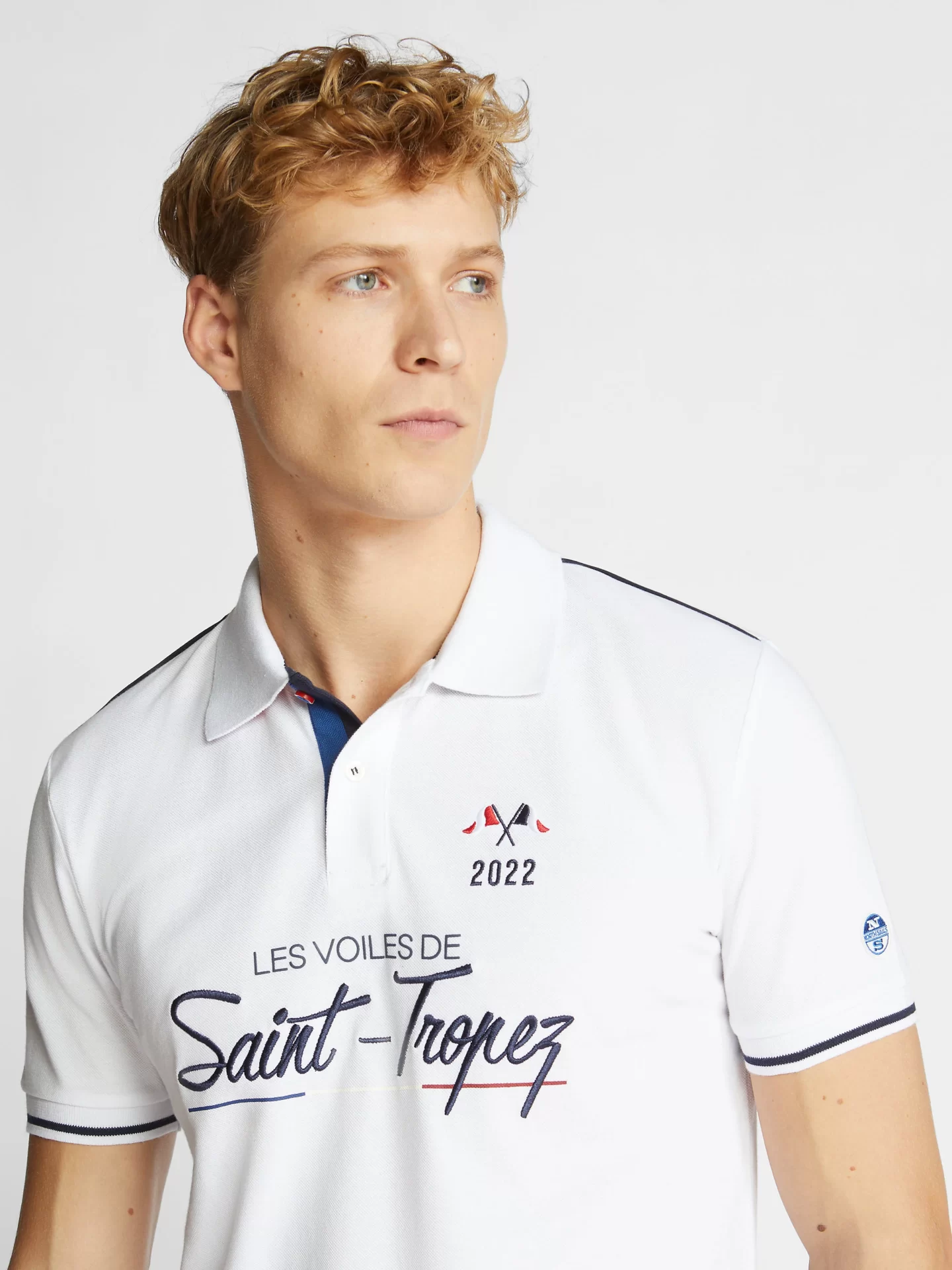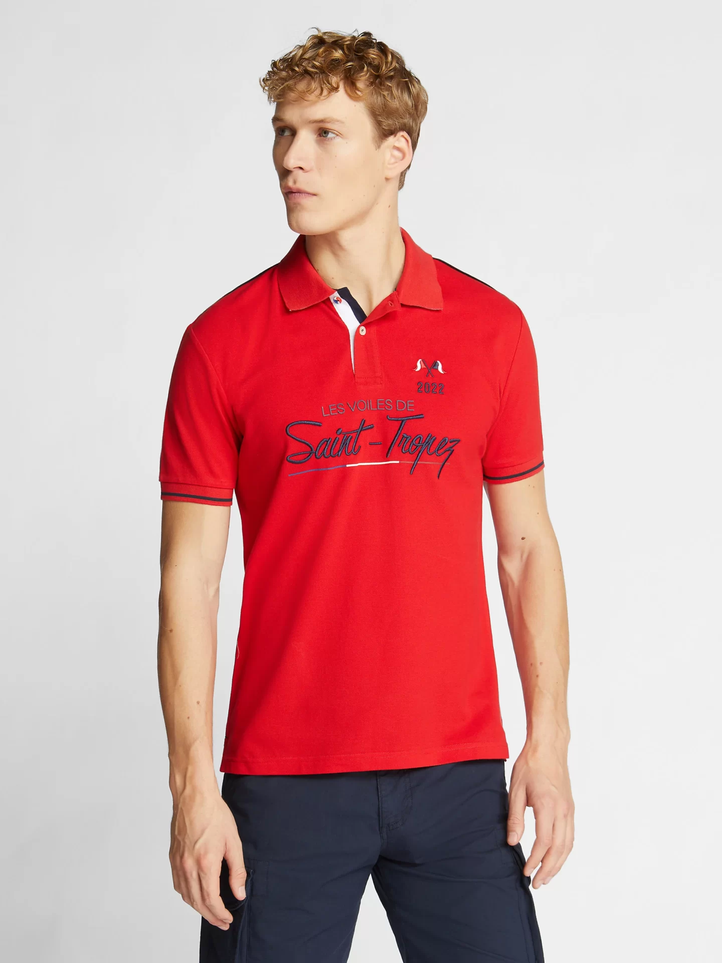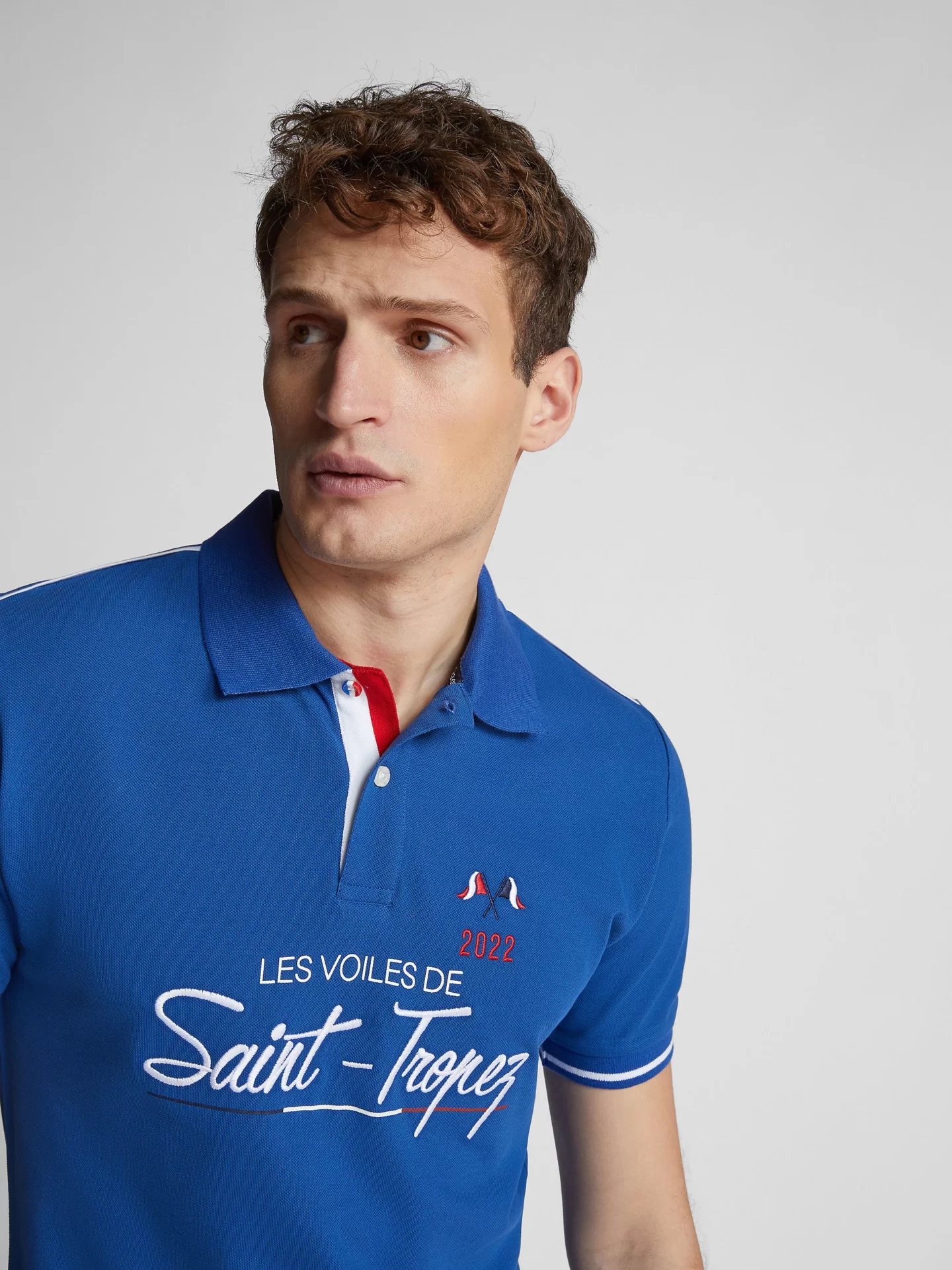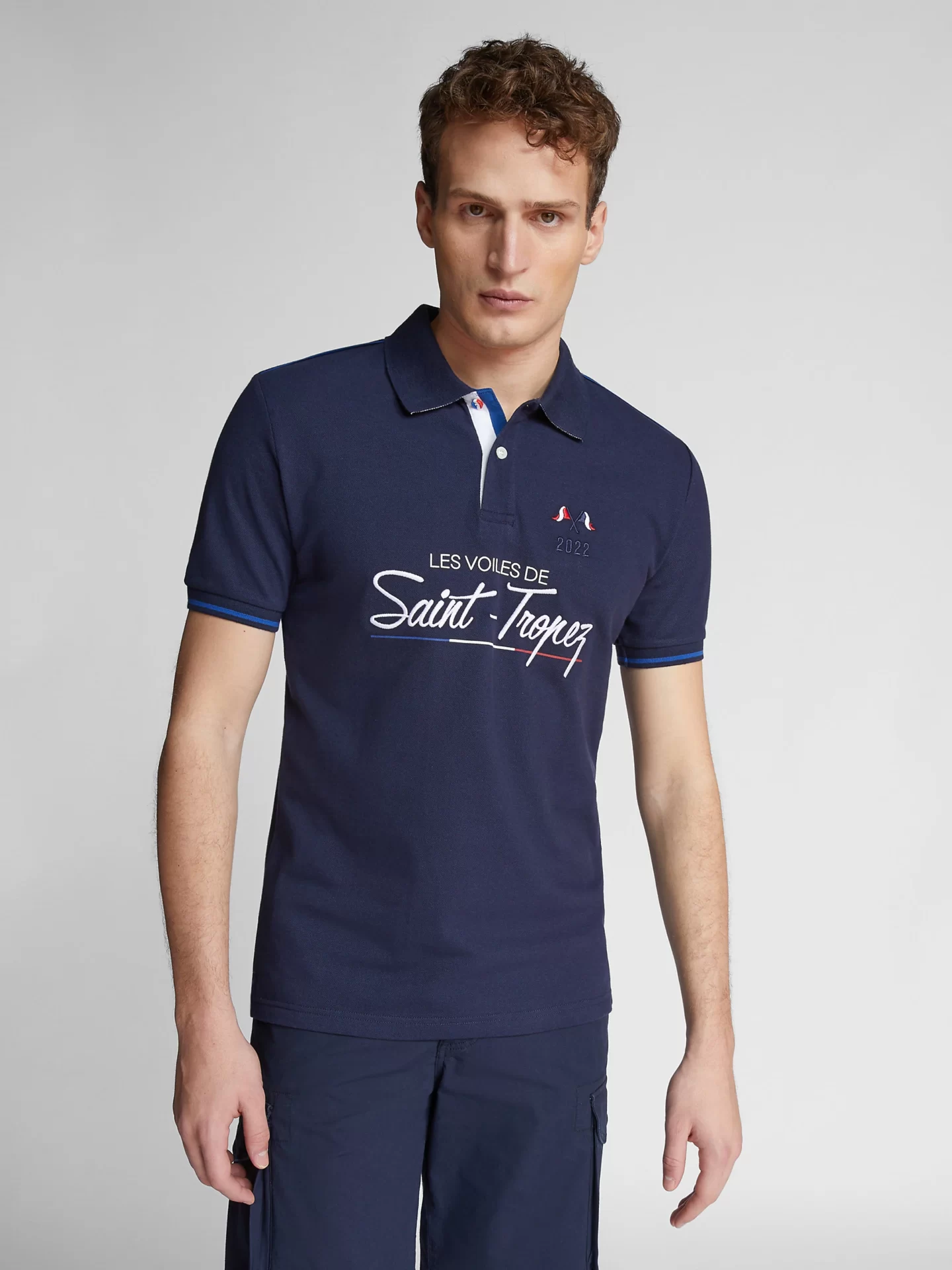 Issu de la collection Les Voiles de Saint-Tropez, ce polo présente une coupe standard avec un col polo classique et des manches courtes. Confectionné en piqué de coton biologique certifié, il a été conçu selon des principes socialement responsables et écologiques, sans utilisation de substances nocives. Les liserés côtelés avec bordure contrastée lui confère une coupe ajustée. Sa maxi broderie à l’avant et ses finitions aux couleurs du drapeau français sont un hommage à la légendaire régate Les Voiles de Saint-Tropez.