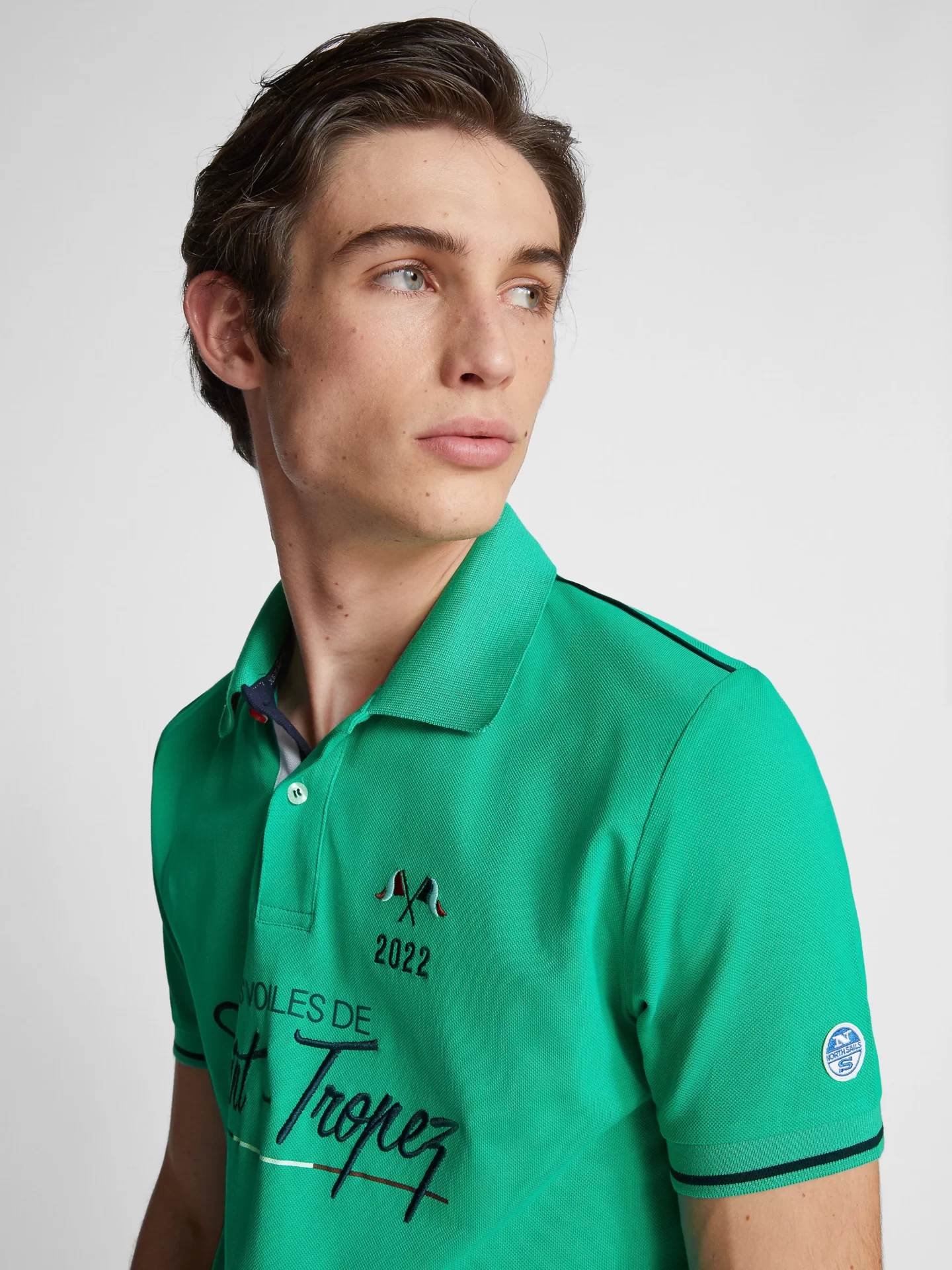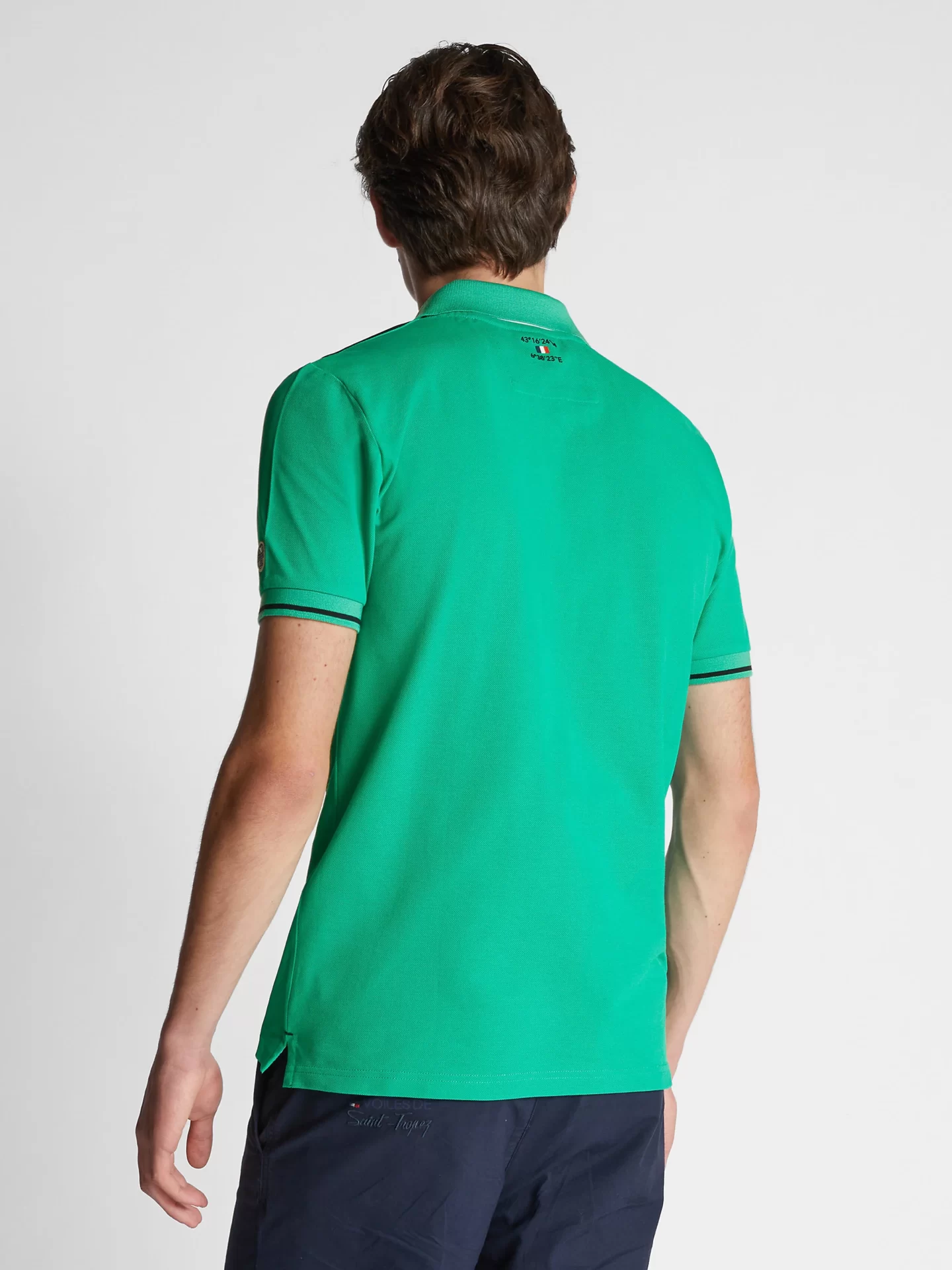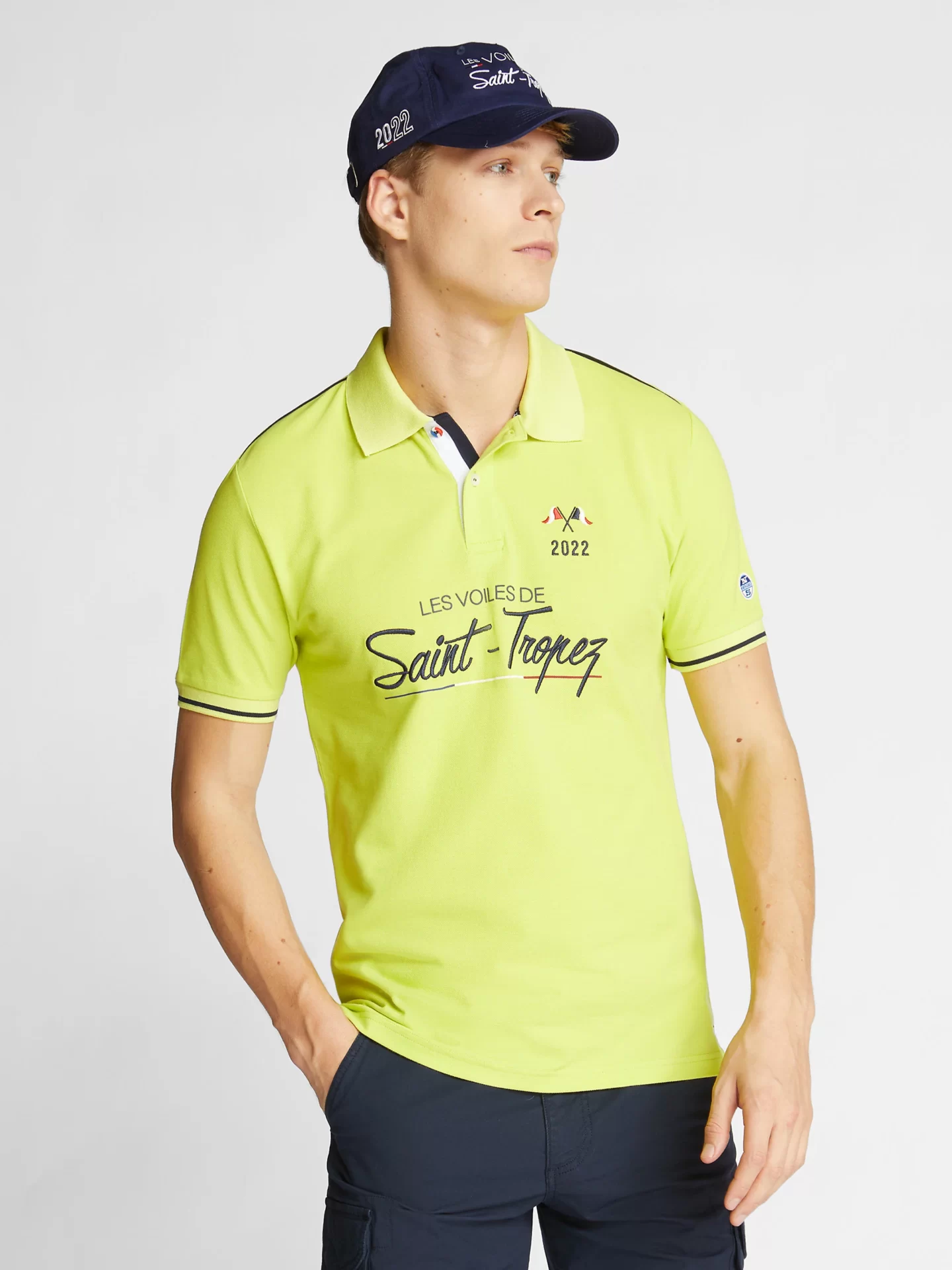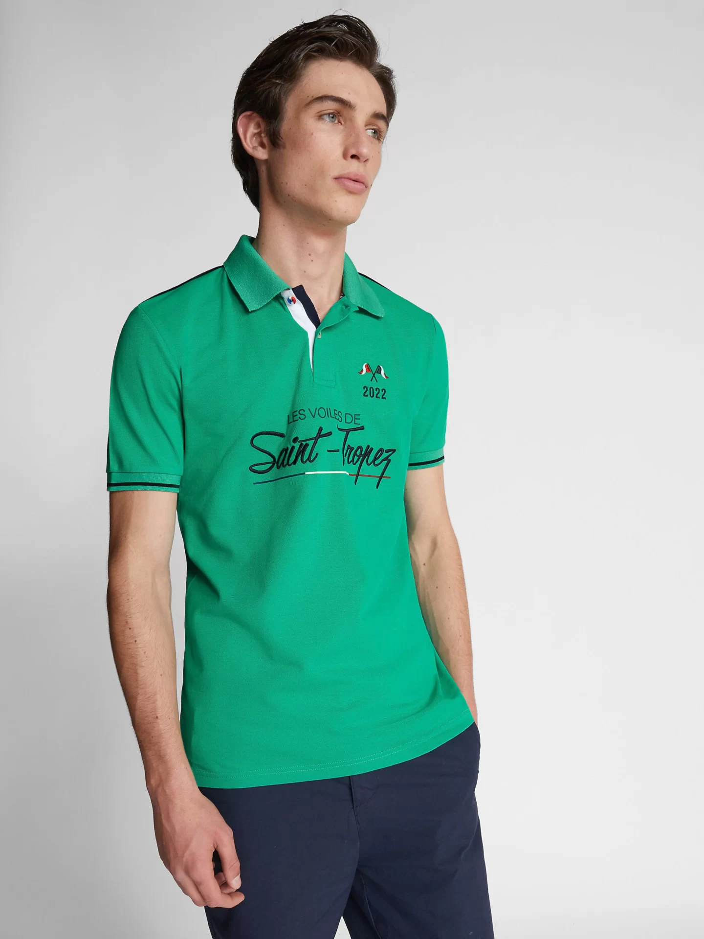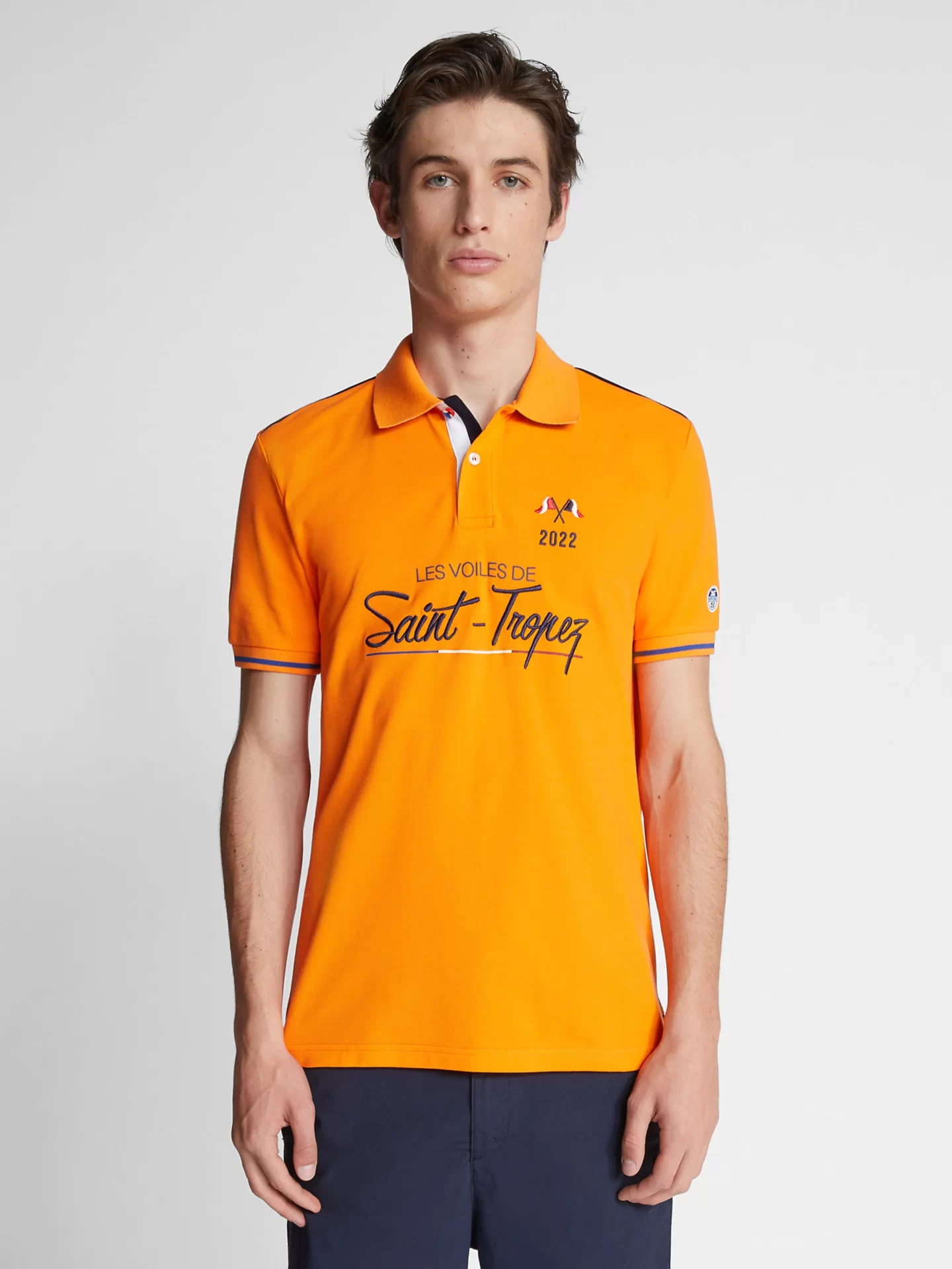 Issu de la collection Les Voiles de Saint-Tropez, ce polo présente une coupe standard avec un col polo classique et des manches courtes. Confectionné en piqué de coton biologique certifié, il a été conçu selon des principes socialement responsables et écologiques, sans utilisation de substances nocives. Les liserés côtelés avec bordure contrastée lui confère une coupe ajustée. Sa maxi broderie à l’avant et ses finitions aux couleurs du drapeau français sont un hommage à la légendaire régate Les Voiles de Saint-Tropez.