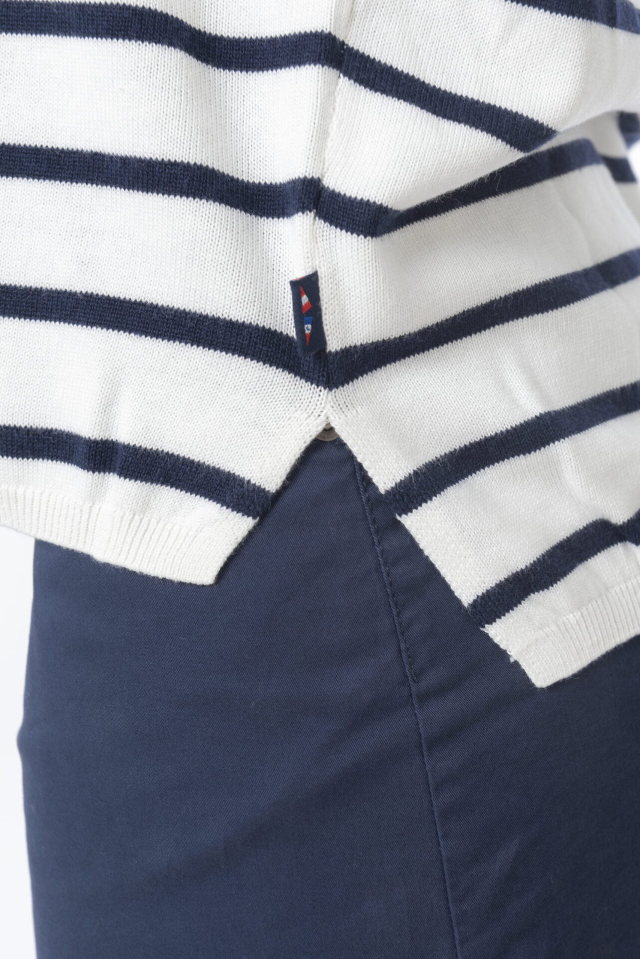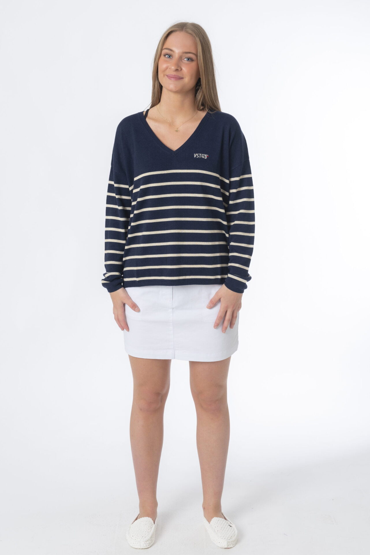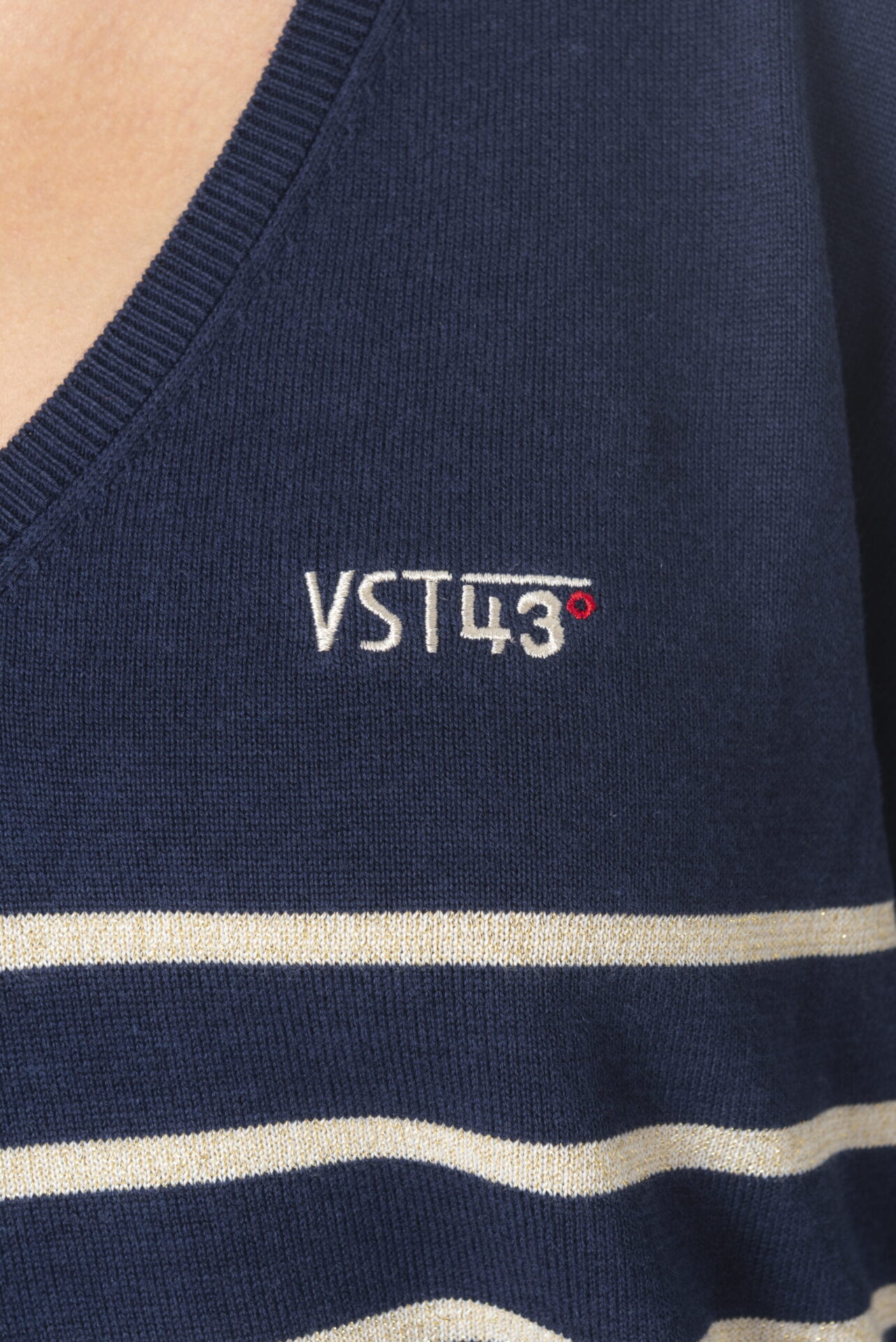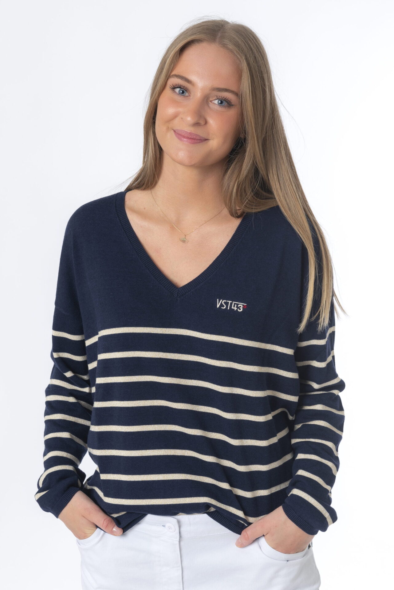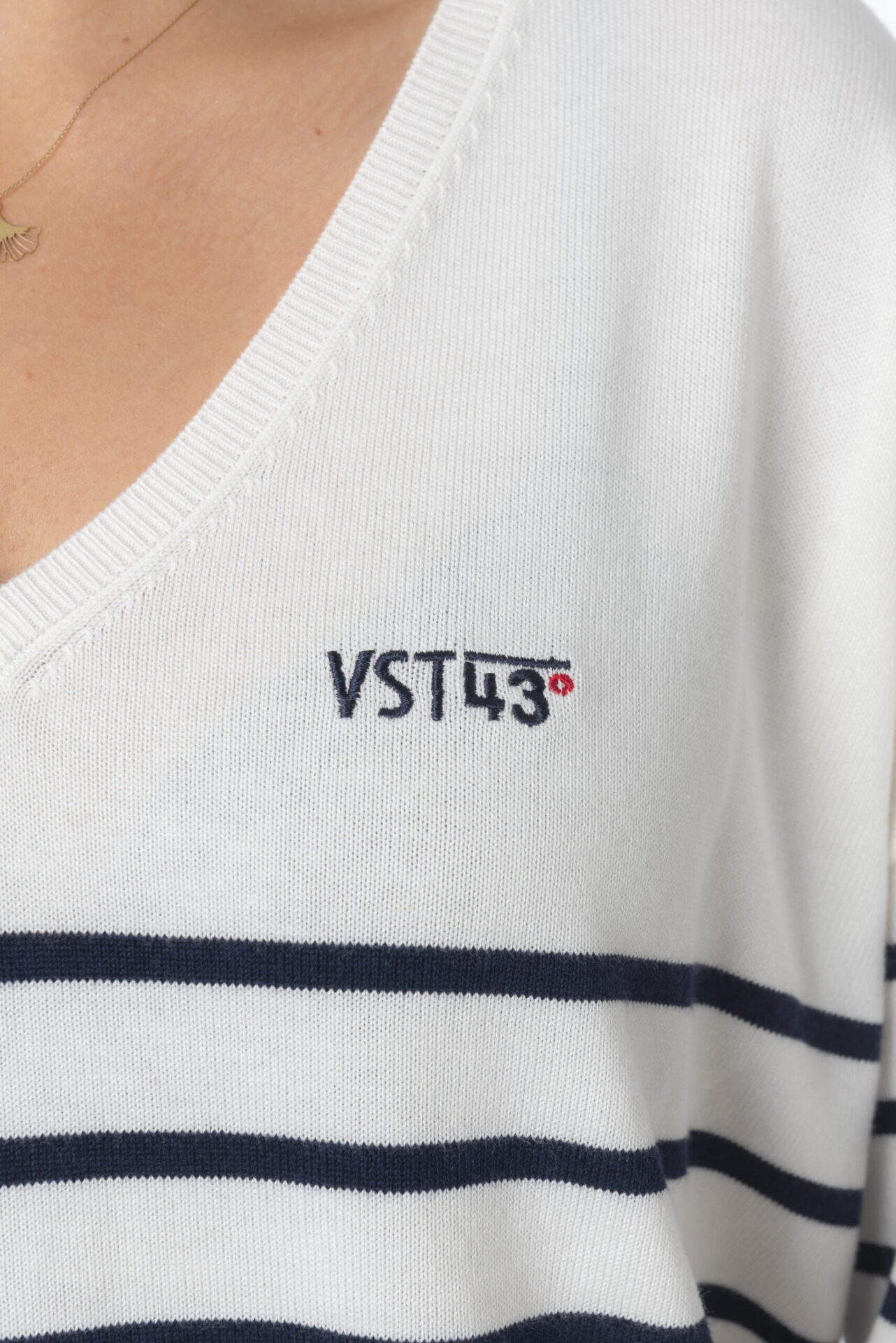 Le pull marinière Lips est fabriqué en coton. Agréable à porter, il présente une coupe large ou « oversize ». L’encolure en V apporte une touche de modernité à la classique marinière. Il arbore une broderie discrète à la poitrine qui renforce son appartenance à la collection VST43°.