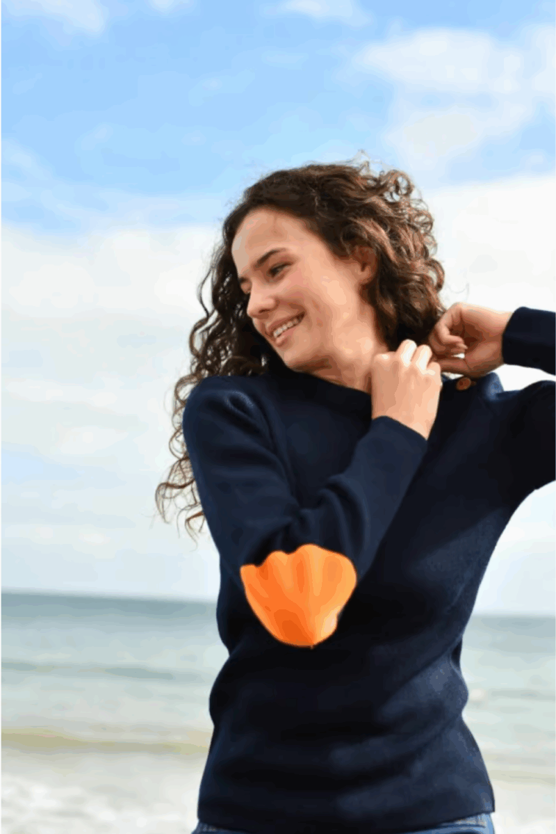 Pull marin femme bleu marine – PERTH – Fabriqué en France – Coudes orange – Boutons en olivier