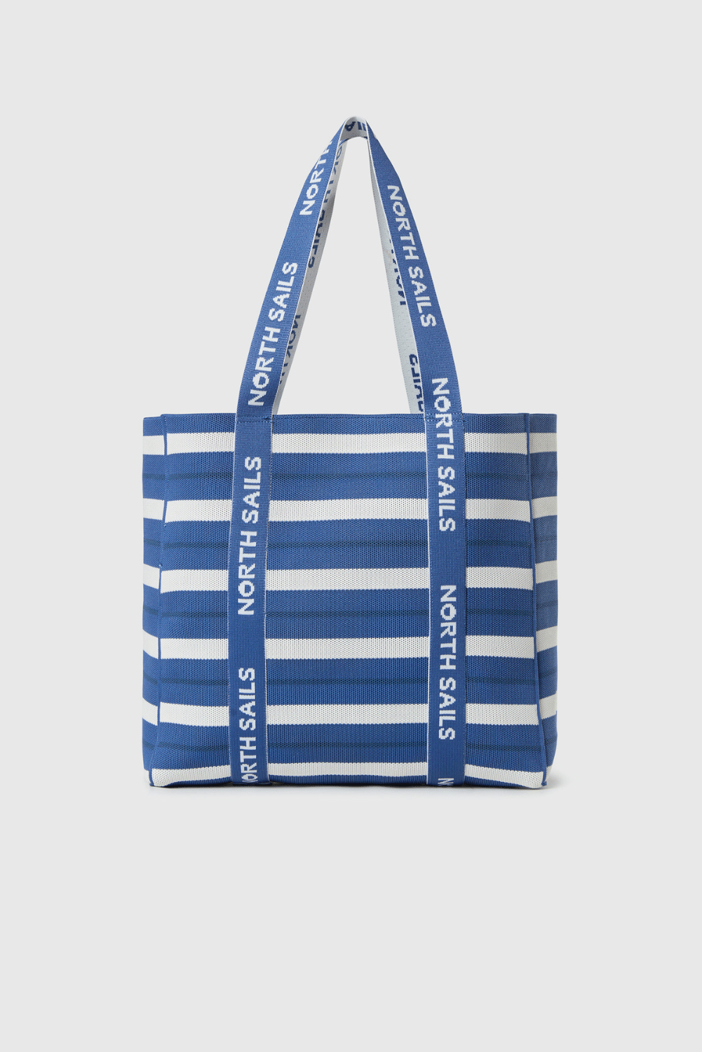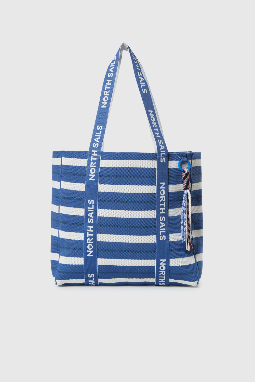 Inspiré par l'océan, destiné à l'aventure. Ce sac tote en maille épaisse évoque nos origines marines avec ses rayures nautiques et son porte-clés en corde détachable. Son design spacieux accueillera tous vos objets essentiels du quotidien, en les gardant en toute sécurité grâce à son fermoir aimanté simple.