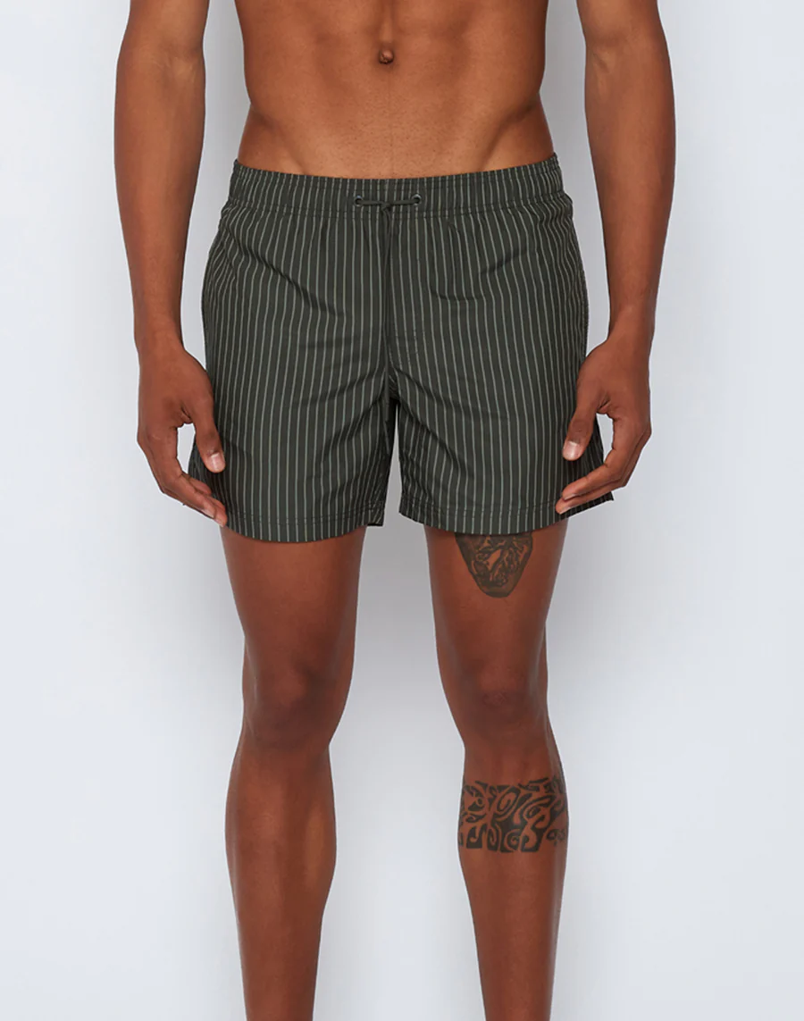 Short de bain à rayures pour homme avec taille élastique teinte en fil et cordon de serrage. Ce maillot de bain est doté de poches latérales et d’une poche arrière.