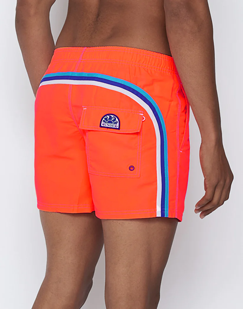 Ce short de bain pour homme est doté d'une ceinture élastique, d'un cordon de serrage et de l'arc-en-ciel emblématique de Sundek à l'arrière. Confectionné avec des coutures à trois aiguilles, il est entièrement fabriqué à partir de nylon-taffetas, le tissu historique de Sundek. Cette matière, douce, légère et résistante, est capable de sécher rapidement, ce qui vous permet de profiter d'un grand confort aussi bien sur que hors de l'eau.
