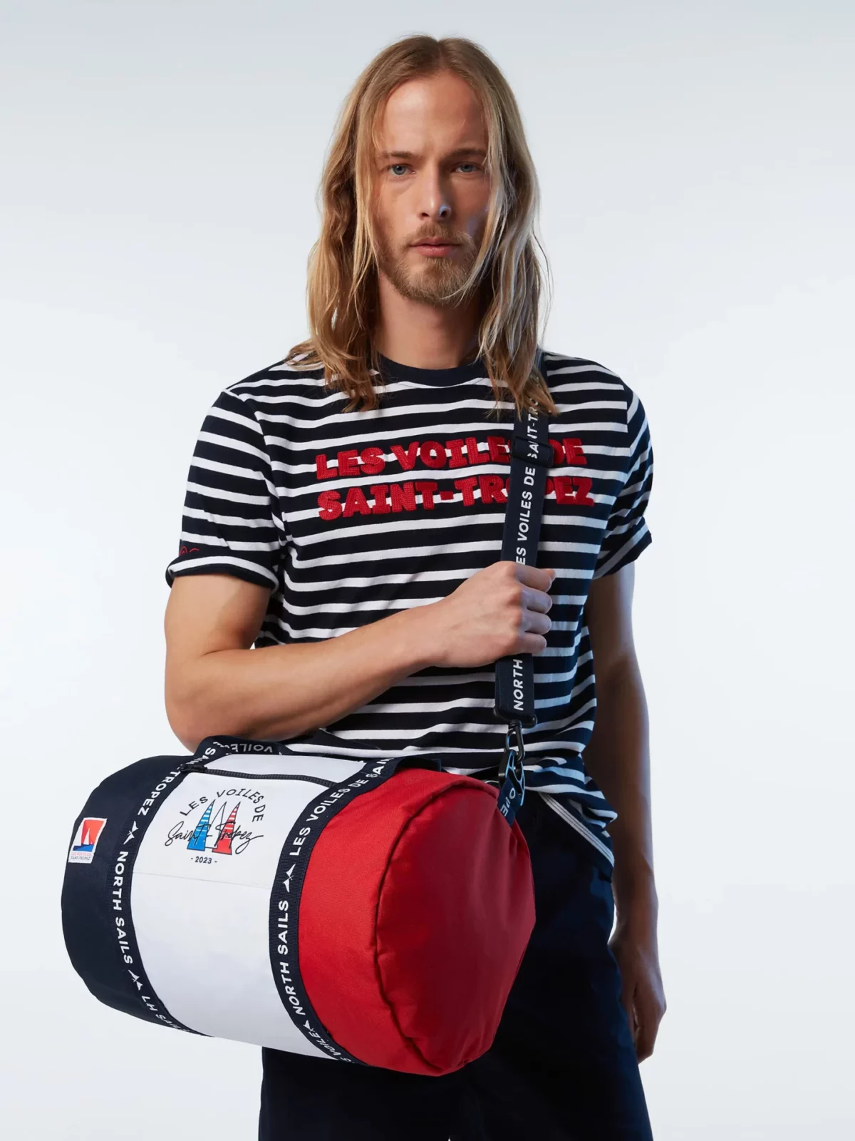 Ce t-shirt pour hommes à rayures est fabriqué en jersey de coton biologique et fait partie de la collection capsule Les Voiles de Saint-Tropez. Il est agrémenté d’une inscription brodée sur la poitrine et de l’année 2023 brodée sur la manche, en hommage à la légendaire régate.