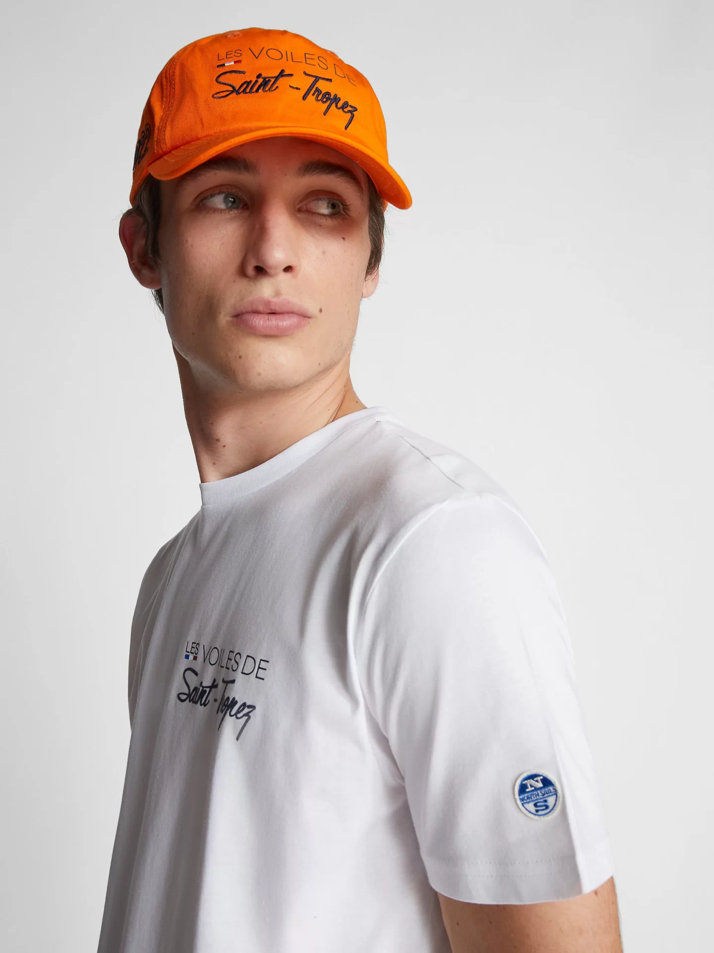 Ce t-shirt, partie intégrante de la collection 2022 Les Voiles de Saint-Tropez, présente une coupe standard avec un col rond et des manches courtes. Il est fabriqué en jersey de coton biologique certifié, conçu selon des principes socialement responsables et écologiques, sans utilisation de substances nocives. Ses finitions sont agrémentées d’impressions sur la manche et la poitrine en hommage à la régate historique Les Voiles de Saint-Tropez.